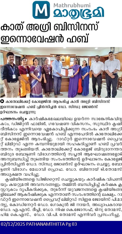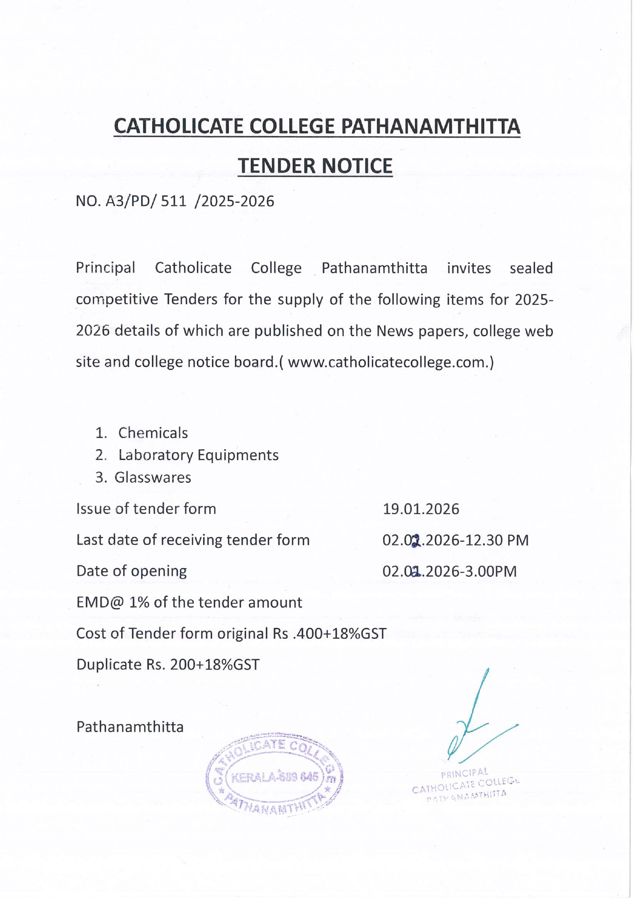 Catholicate College, Pathanamthitta invites sealed quotations from reputed suppliers for the supply and installation of a Water Cooler with UV Purifier. The last date for submission of quotations is 02.02.2026.